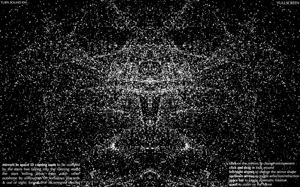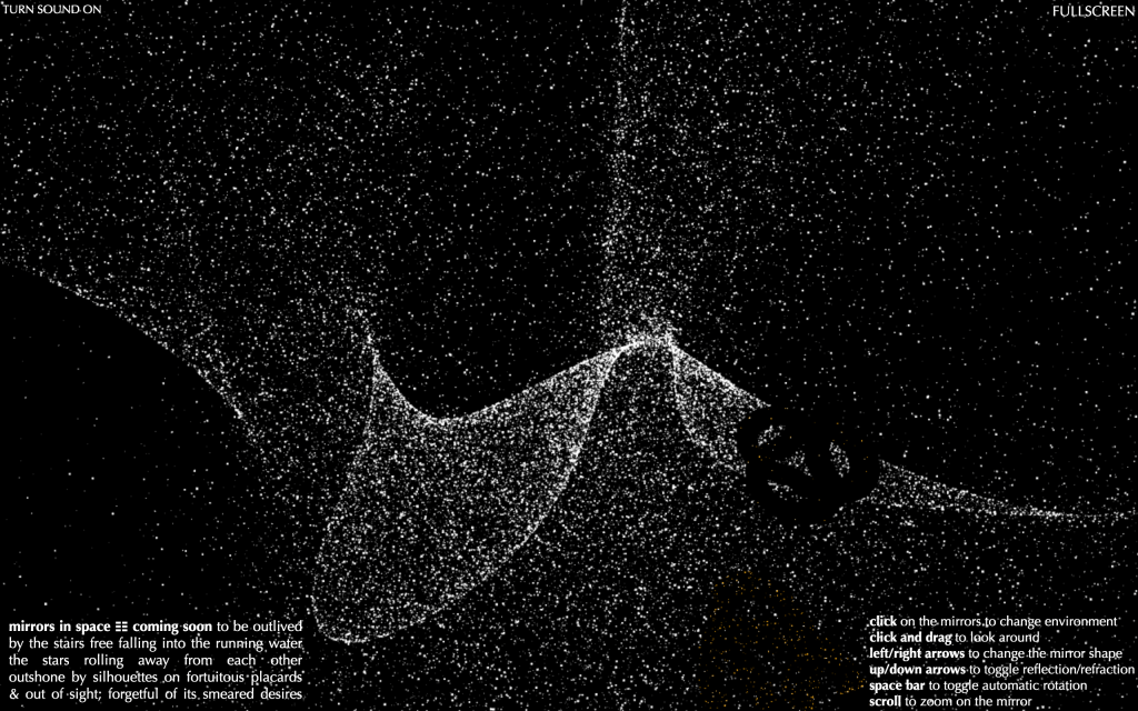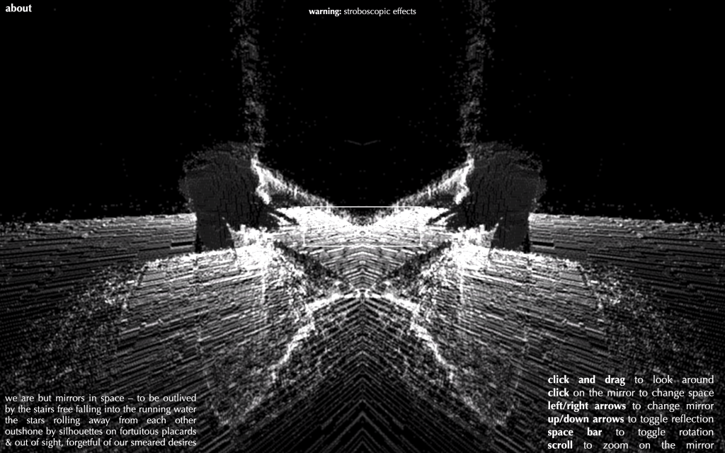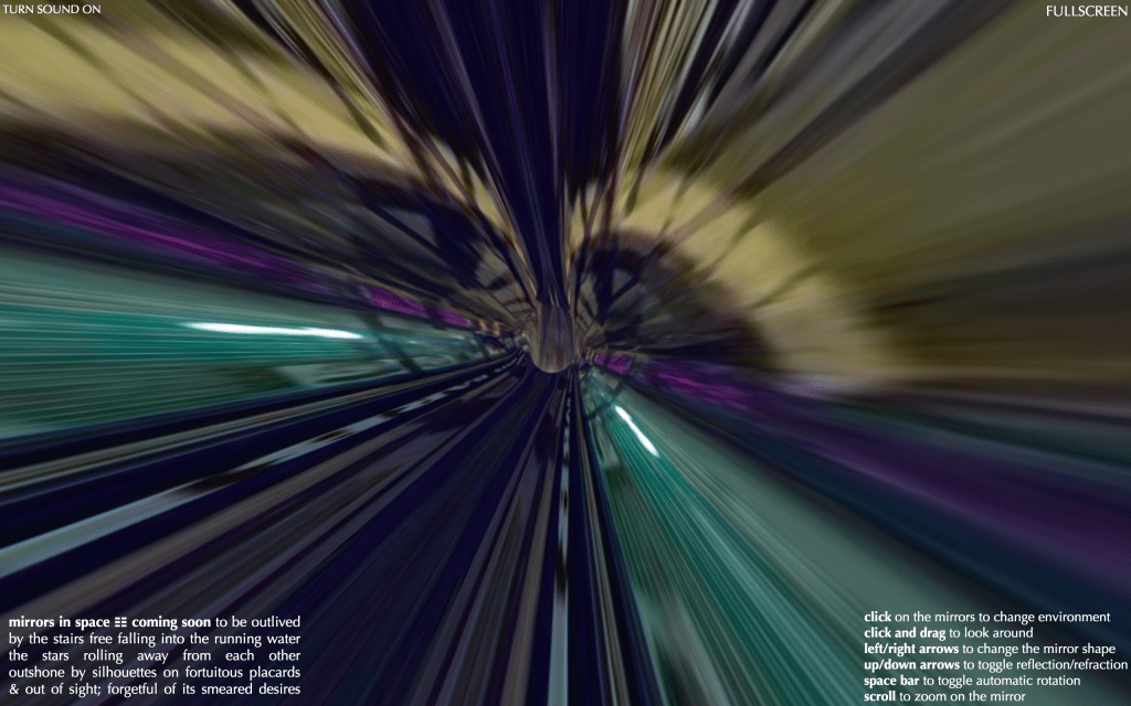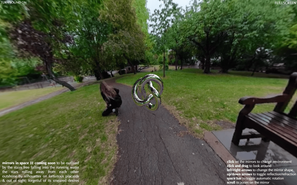 Mirrors In Space (MIS) is an ever-evolving immersive website that consists of a 3D virtual space where visitors are able to attend a series of performative events in an interactive online browser. Algorithmic video-art via script and visual programming languages formulate a journey for viewers to navigate through 360° dance performances. As the space continues to grow with the release of new content and zones, the viewer has autonomy of duration, framing, mood and navigation throughout the experience using their keyboard and mouse.