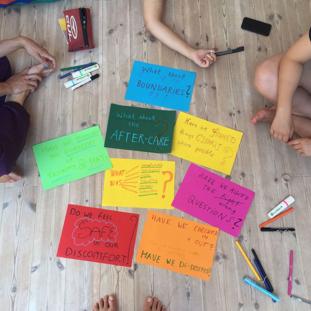 We are aware that extreme acts of violence can happen at an interpersonal level – we are committed to not taking this for granted. We began our process with a three day Consent Workshop and collectively posed the following important questions to hold us throughout our time together. We are inspired by Báyò Akómoláfé’s honouring of ‘the presence of questions’. We think of questions as tools for navigation rather than something to be answered: